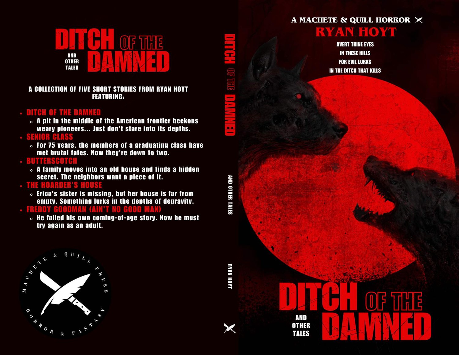 This listing is for the paperback edition of Ditch of the Damned and Other Tales, a new five-story collection from author Ryan Hoyt. Four stories are horror while one is a horror-adjacent belated coming-of-age tale. The collection is 170 pages, or approximately novella length. Cover art by Matt Seff Barnes.
